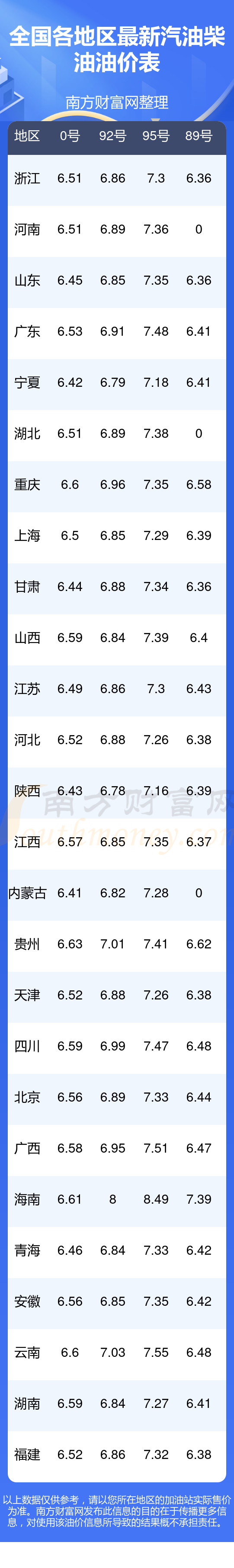 以上數(shù)據(jù)僅供參考,請以您所在地區(qū)的加油站實際售價為準(zhǔn)。南方財富網(wǎng)發(fā)布此信息的目的在于傳播更多信息,對使用該油價信息所導(dǎo)致的結(jié)果概不承擔(dān)責(zé)任。