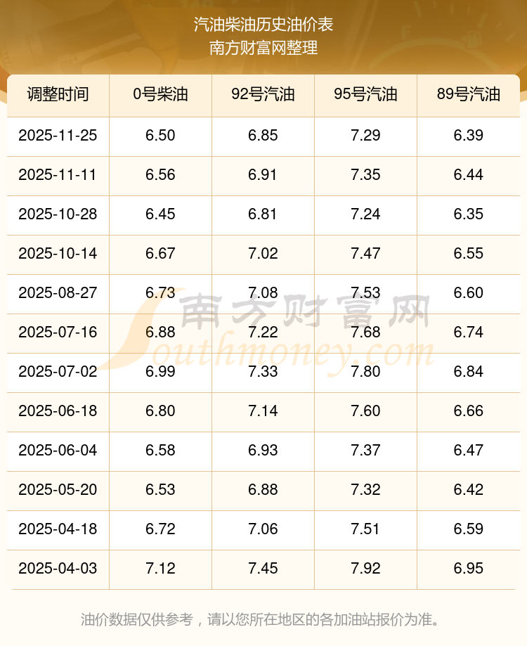 12月3日上海奉賢92號汽油的價格為11月25日油價調(diào)整后的價格,每升6.85元,對比上一輪油價調(diào)整時間11月11日的價格6.91元每升,下跌了0.06元,下跌幅達0.868%。下一輪油價調(diào)整時間12月8日24時,距離現(xiàn)在還有5.26天。