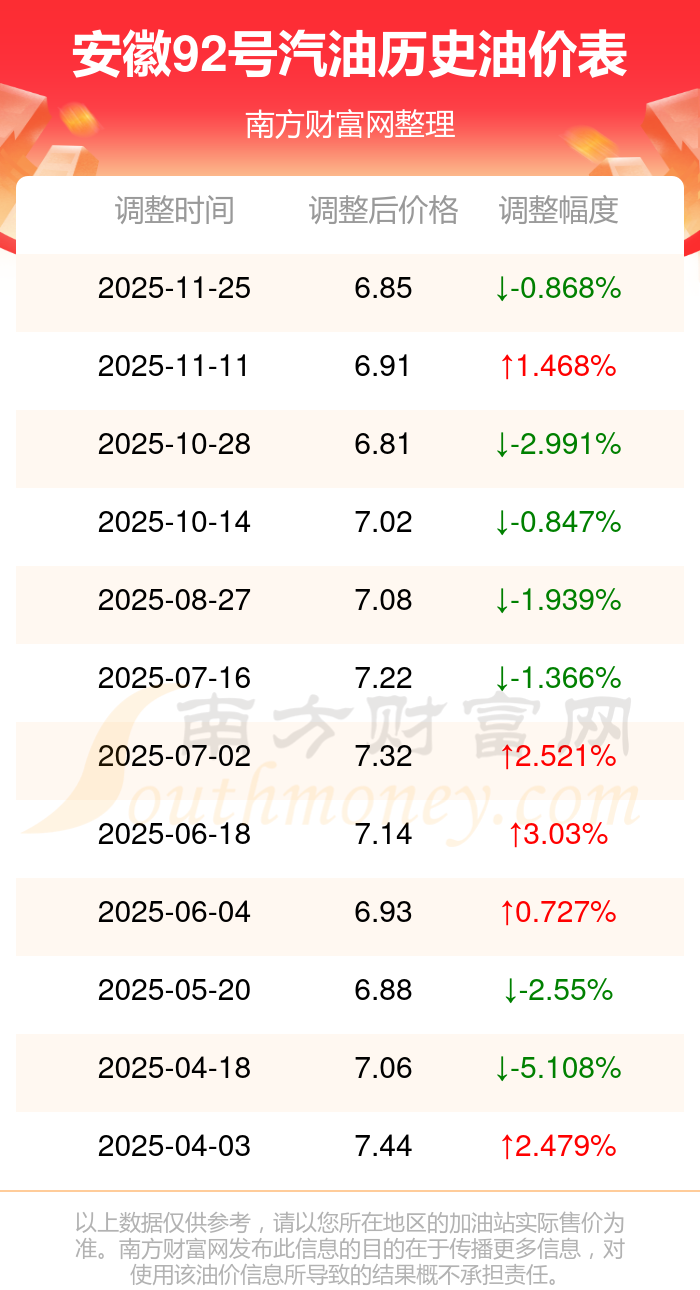 12月3日,安徽92號汽油的價(jià)格是6.85元每升,本次的調(diào)整時(shí)間為11月25日,對比上次的調(diào)整下調(diào)了0.06元,下調(diào)0.868%,12月8日24時(shí)為下一輪油價(jià)調(diào)整時(shí)間,還有5.24天。