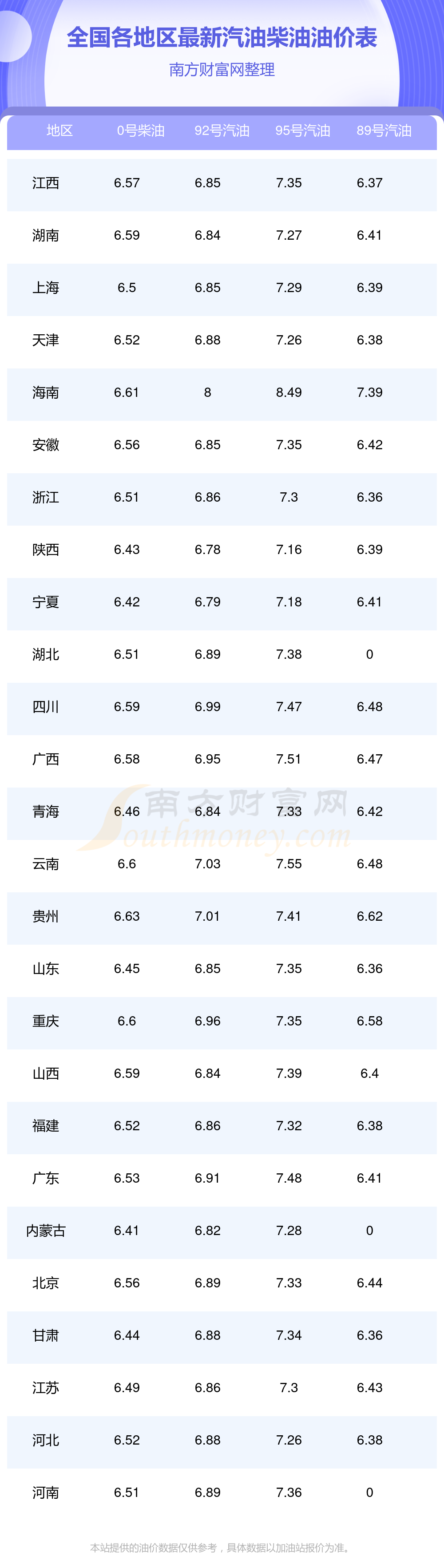 全國89號汽油最新平均價格為:6元每升,其中,最低為浙江,價格為6.36元/升,最高為海南,價格為7.39元/升。