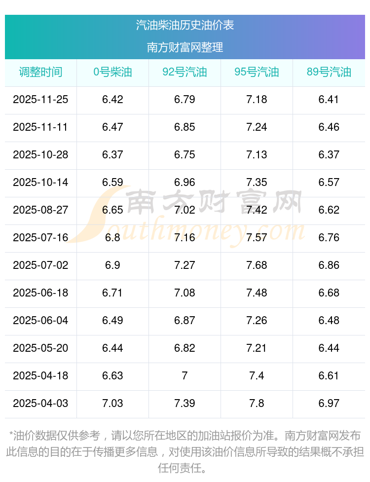 2025年95號(hào)汽油價(jià)格一覽表