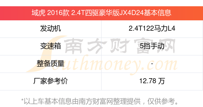 在動力方面,??虎 2016款 2.4T四驅(qū)豪華版JX4D24搭載的是一臺2.4T122馬力L4渦輪增壓發(fā)動機,匹配5擋手動擋變速箱,燃料形式為柴油,廠家參考價12.78萬元。