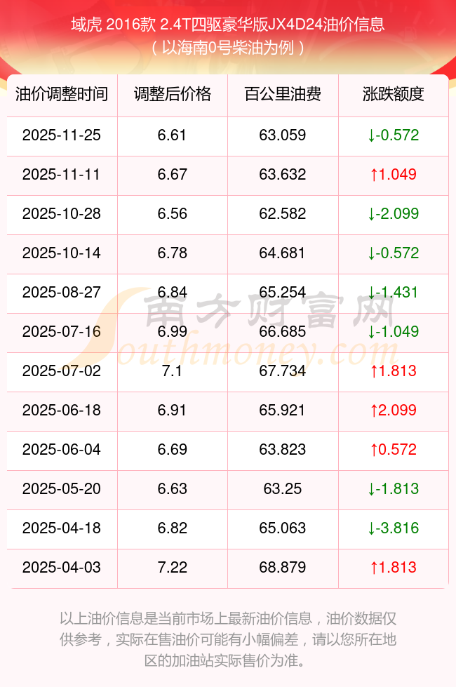 根據(jù)11月25日0號柴油最新調(diào)整價格6.61元/升來計算(以海南為例),該車型每百公里的平均油費是63.059元,上一輪11月11日調(diào)整價格6.67元每升來計算,每百公里的平均油費是63.632元,對比上一輪少花0.572元,下一輪的油價調(diào)整時間是12月8日24時。