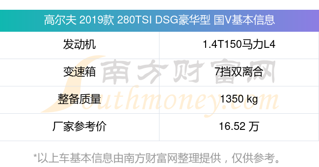 高爾夫 2019款 280TSI DSG豪華型 國V動(dòng)力上配備的是一臺1.4T150馬力L4渦輪增壓發(fā)動(dòng)機(jī),匹配的是7擋雙離合自動(dòng)檔變速箱,燃料形式為汽油,常規(guī)整備質(zhì)量1350kg,廠家參考價(jià)16.52萬元。