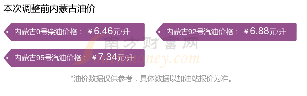 12月3日,內(nèi)蒙古汽油、柴油每升的價格為:92號汽油6.82元,下降了0.06元;95號汽油7.28元,下降了0.06元;0號柴油為6.41元,下降了0.05元,本輪調(diào)整時間是11月25日。