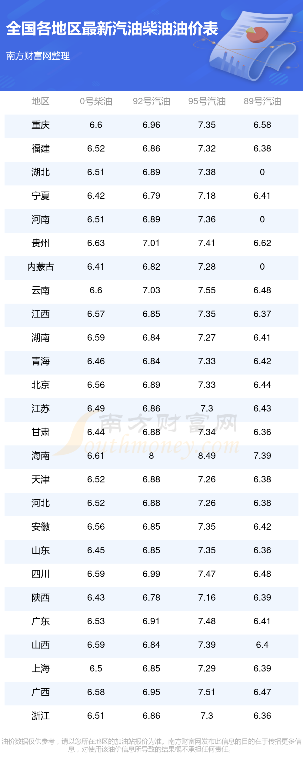 油價數(shù)據(jù)僅供參考,請以您所在地區(qū)的加油站報價為準。南方財富網(wǎng)發(fā)布此信息的目的在于傳播更多信息,對使用該油價信息所導致的結(jié)果概不承擔任何責任。