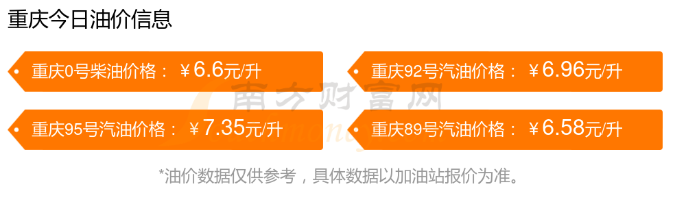 重慶汽油、柴油12月3日每升的價格是多少?具體為:92號汽油為6.96元,減了0.05元;95號汽油為7.35元,減了0.06元;89號汽油為6.58元,減了0.05元;0號柴油為6.6元,減了0.05元,本輪油價的調整時間為11月25日。