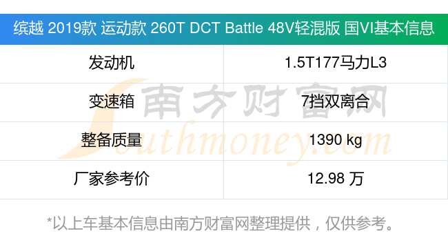 繽越 2019款 運(yùn)動(dòng)款 260T DCT Battle 48V輕混版 國(guó)VI搭載了一臺(tái)1.5T177馬力L3渦輪增壓發(fā)動(dòng)機(jī),采用7擋雙離合自動(dòng)檔變速箱,常規(guī)整備質(zhì)量1390kg,廠家參考價(jià)12.98萬(wàn)元。