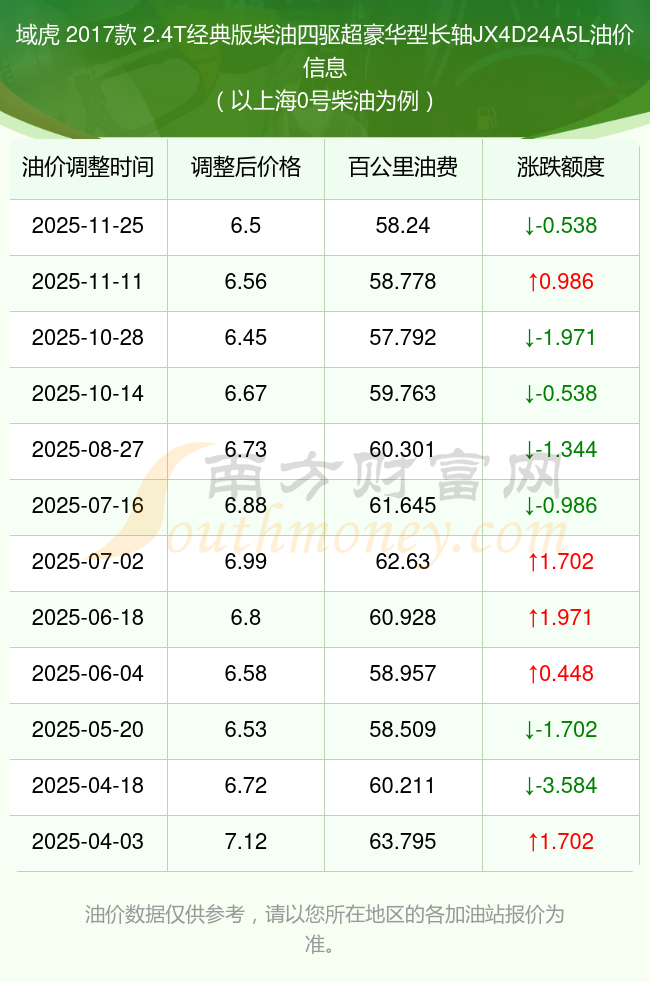 按11月25日0號柴油最新調(diào)整價格6.5元每升來計算(以上海為例),該車型百公里平均油費為58.24元,按上一輪11月11日調(diào)整價格6.56元每升來計算,百公里平均油費為58.778元,對比上一輪少花0.538元,下一輪油價調(diào)整時間為12月8日24時。