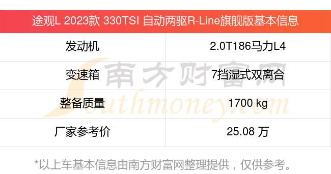 在動(dòng)力上,途觀L 2023款 330TSI 自動(dòng)兩驅(qū)R-Line旗艦版配備的是一臺(tái)2.0T186馬力L4渦輪增壓發(fā)動(dòng)機(jī),匹配的是7擋濕式雙離合自動(dòng)檔變速箱,燃料形式為汽油,常規(guī)整備質(zhì)量1700kg,廠家參考價(jià)25.08萬(wàn)元。