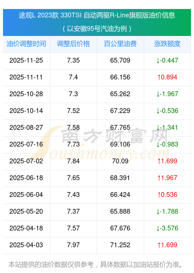 依照11月25日95號(hào)汽油最新調(diào)整價(jià)格7.35元/升來(lái)計(jì)算(以安徽為例),該車型百公里的平均油費(fèi)是65.709元,依照上一輪11月11日調(diào)整價(jià)格7.4元/升來(lái)計(jì)算,百公里的平均油費(fèi)是66.156元,對(duì)比上一輪少花0.447元,下一輪的油價(jià)調(diào)整時(shí)間12月8日24時(shí)。