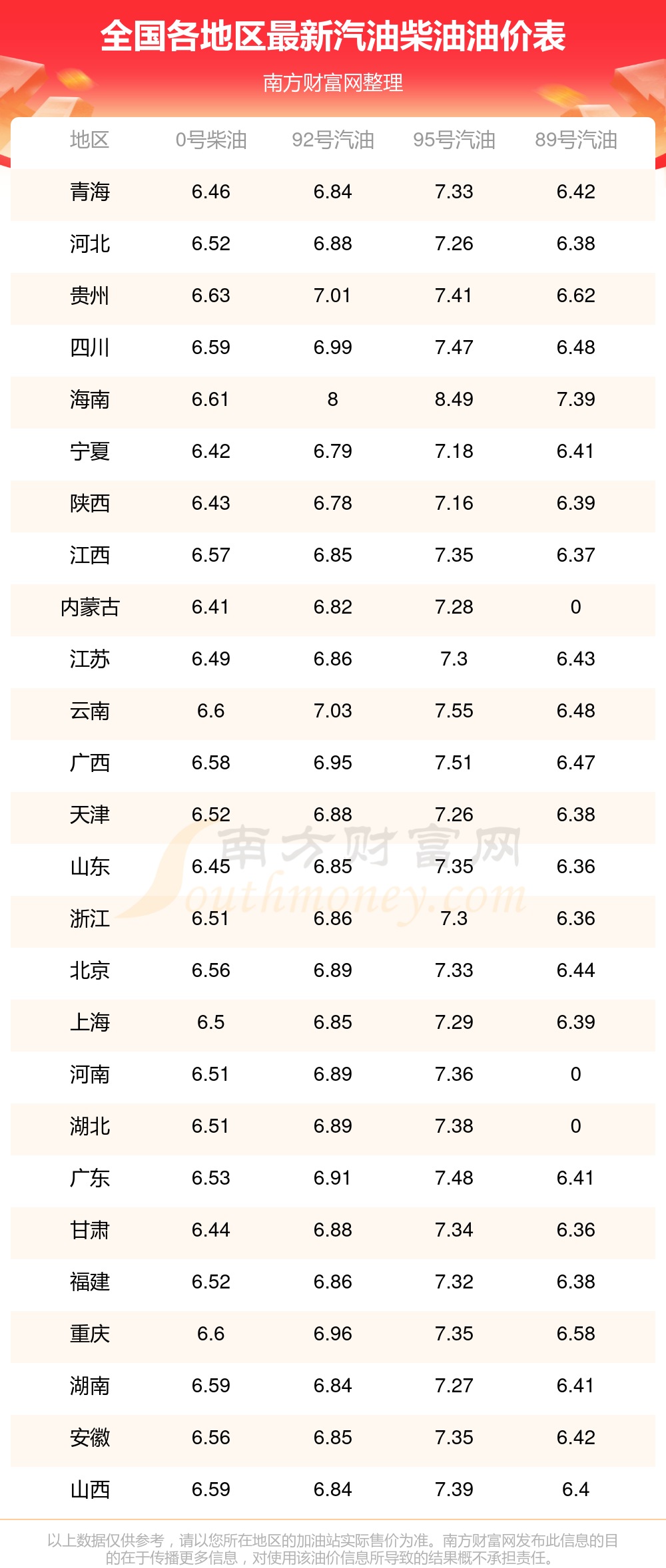 12月3日全國89號汽油的價格為11月25日油價調(diào)整后的價格,其中,平均價格為6元每升,最低為浙江,價格6.36元/升,最高為海南,價格7.39元/升。下一輪油價調(diào)整時間12月8日24時,距離現(xiàn)在還有5.16天。