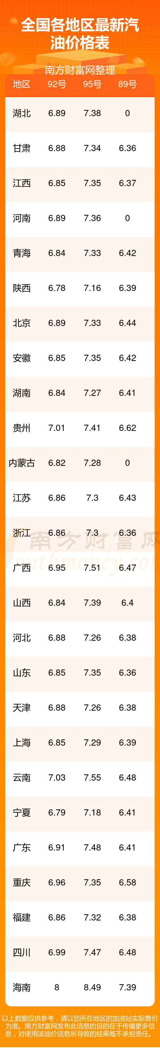 油價(jià)數(shù)據(jù)僅供參考,請(qǐng)以您所在地區(qū)的加油站報(bào)價(jià)為準(zhǔn)。南方財(cái)富網(wǎng)發(fā)布此信息的目的在于傳播更多信息,對(duì)使用該油價(jià)信息所導(dǎo)致的結(jié)果概不承擔(dān)任何責(zé)任。
