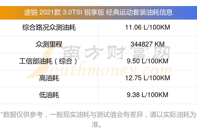 根據(jù)車主實(shí)測(cè)數(shù)據(jù),該車型低油耗為9.38L/100km,高油耗為12.75L/100km,綜合路況眾測(cè)油耗為11.06L/100km,工信部綜合油耗為9.50L/100km。