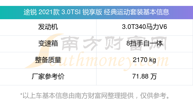 在動(dòng)力方面,途銳 2021款 3.0TSI 銳享版 經(jīng)典運(yùn)動(dòng)套裝搭載的是一臺(tái)3.0T340馬力V6渦輪增壓發(fā)動(dòng)機(jī),匹配8擋手自一體自動(dòng)檔變速箱,燃料形式為汽油,常規(guī)整備質(zhì)量2170kg,廠家參考價(jià)71.88萬元。