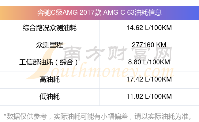 根據多位車主實測得出數(shù)據,該車型低油耗為11.82升/百公里,高油耗為17.42升/百公里,綜合路況眾測油耗為14.62升/百公里,工信部綜合油耗為8.80升/百公里。