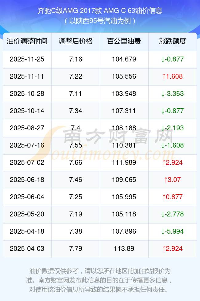 依照11月25日95號汽油最新調整價格7.16元/升來計算(以陜西為例),該車型百公里的平均油費是104.679元,依照上一輪11月11日調整價格7.22元/升來計算,百公里的平均油費是105.556元,對比上一輪少花0.877元,下一輪的油價調整時間12月8日24時。