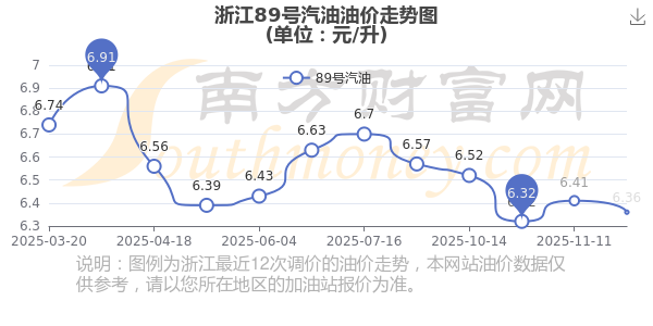 12月4日,浙江89號汽油的價格是6.36元每升,本次的調(diào)整時間為11月25日,對比上次的調(diào)整降了0.05元,降0.78%,下次調(diào)整時間為12月8日24時,還有4.86天。