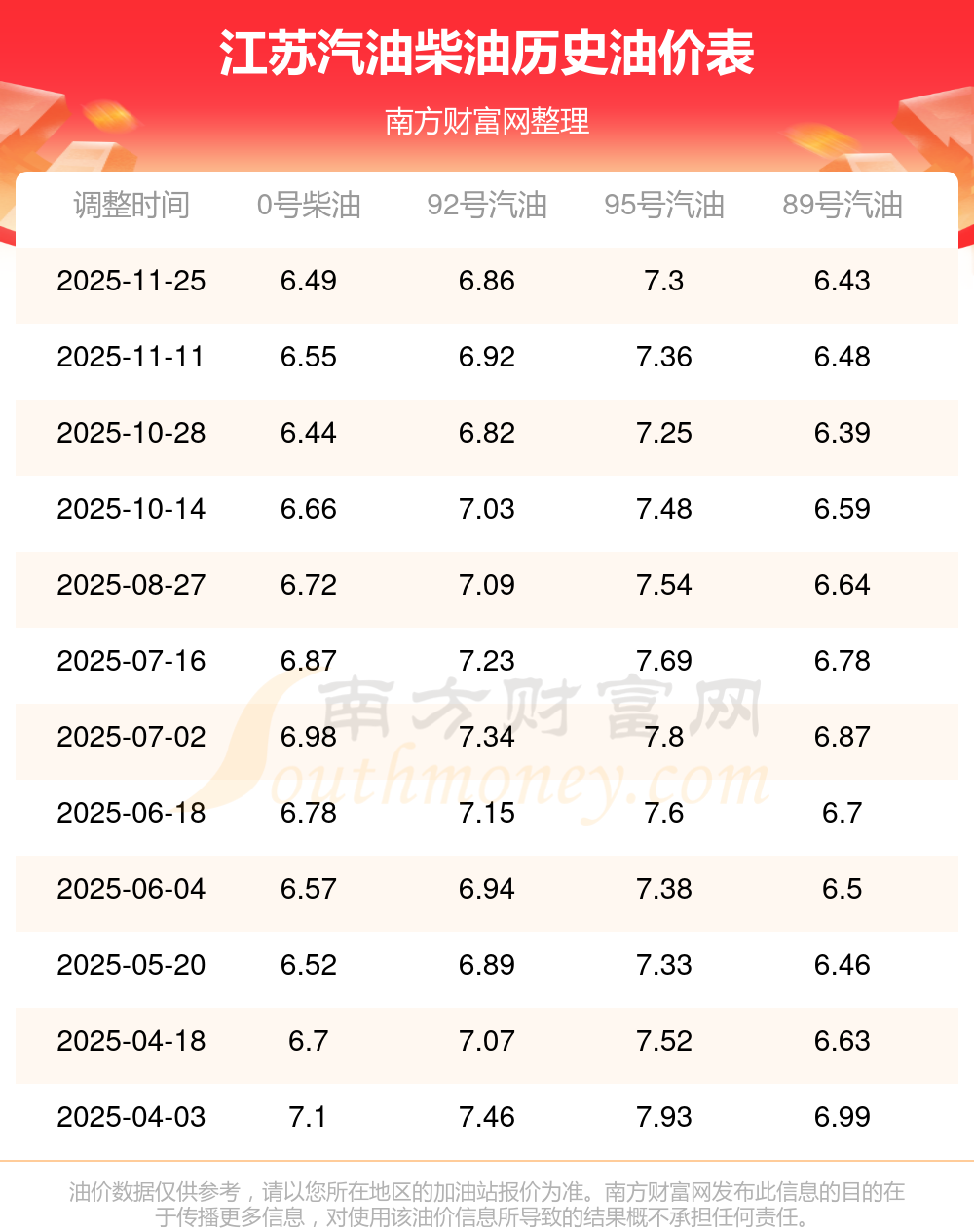 12月4日,江蘇汽油、柴油每升的價格為:92號汽油6.86元,下調(diào)了0.06元;95號汽油7.3元,下調(diào)了0.06元;89號汽油6.43元,下調(diào)了0.05;0號柴油為6.49元,下調(diào)了0.06元,本輪調(diào)整時間是11月25日。