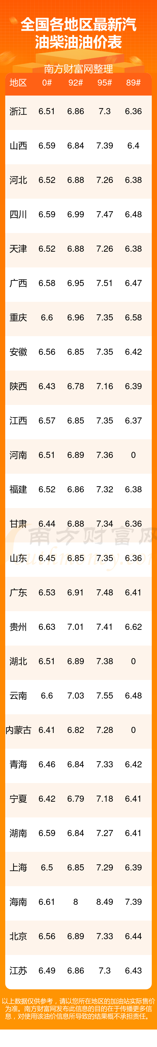 全國各地區(qū)最新油價表