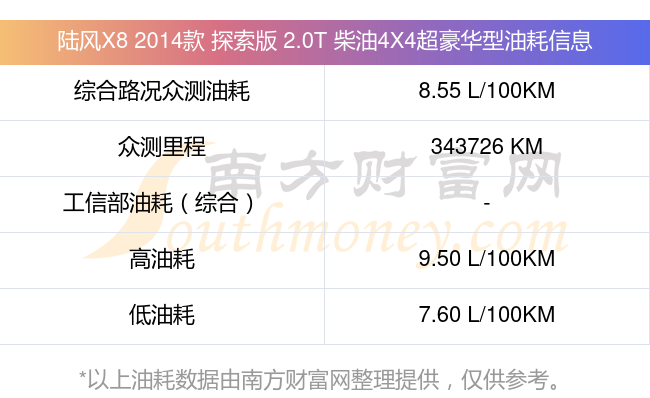 根據(jù)多位車主實(shí)測得出數(shù)據(jù),該車型低油耗為7.60L/100km,高油耗為9.50L/100km,綜合路況眾測油耗為8.55L/100km,工信部綜合油耗為-L/100km。