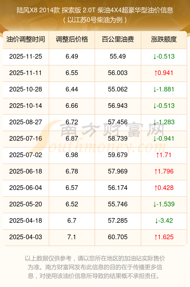 按照11月25日0號柴油最新調(diào)整價格6.49元/升來計算(以江蘇為例),該車型百公里平均油費(fèi)為55.49元,按照上一輪11月11日調(diào)整價格6.55元/升來計算,百公里平均油費(fèi)為56.003元,對比上一輪少花0.513元,下一輪油價調(diào)整時間為12月8日24時。