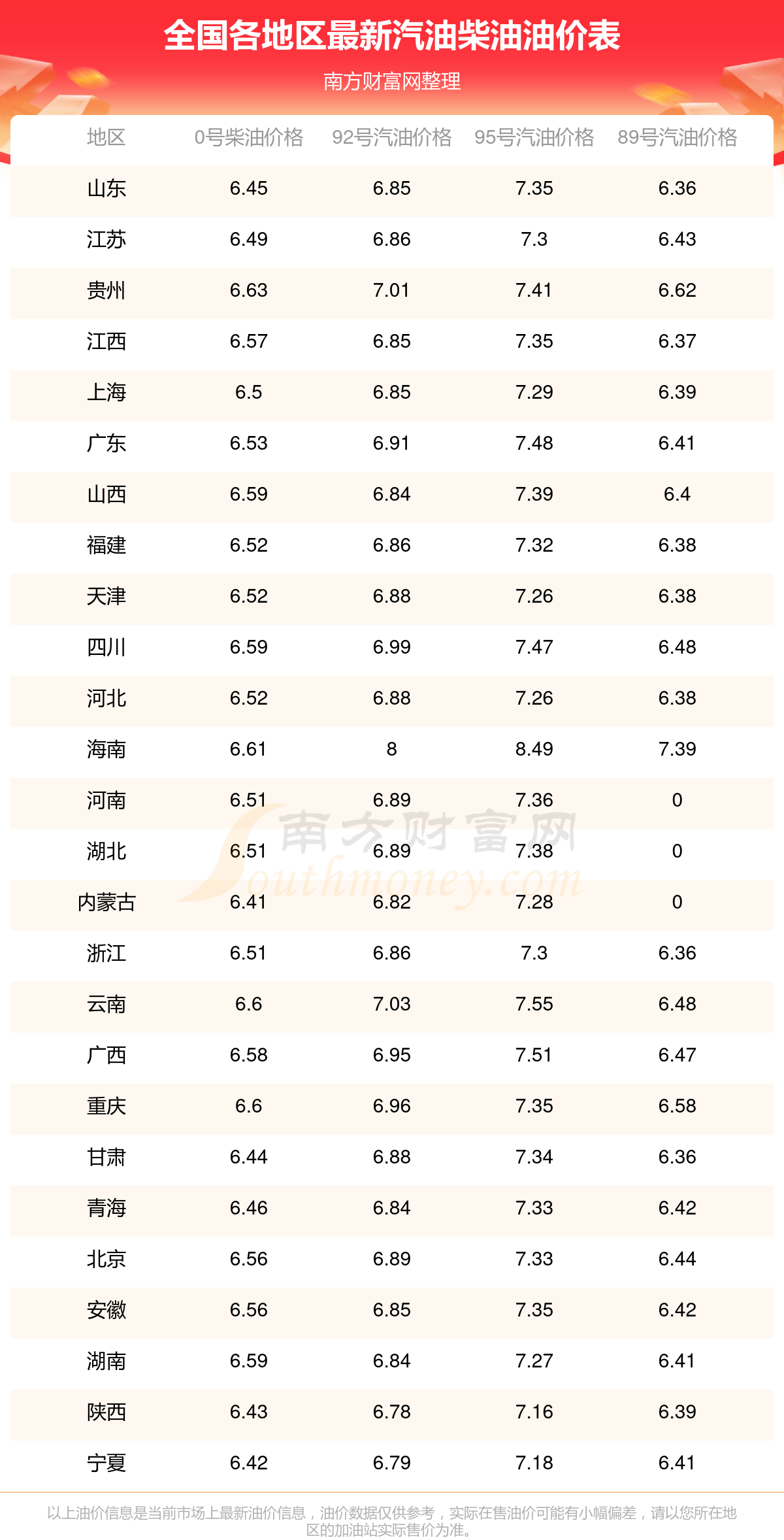 油價數(shù)據(jù)僅供參考,請以您所在地區(qū)的加油站報價為準。南方財富網(wǎng)發(fā)布此信息的目的在于傳播更多信息,對使用該油價信息所導致的結(jié)果概不承擔任何責任。