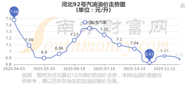12月4日河北92號汽油的價格是6.88元/升,油價調整時間是11月25日,對比上一次油價調整共下調了0.05元。