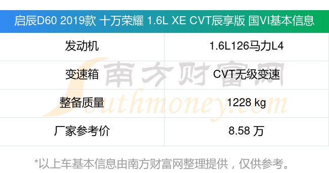 在動力方面,啟辰D60 2019款 十萬榮?? 1.6L XE CVT辰享版 國VI搭載的是一臺1.6L126馬力L4自然吸氣發(fā)動機,匹配CVT無級變速自動檔變速箱,燃料形式為汽油,常規(guī)整備質(zhì)量1228kg,廠家參考價8.58萬元。