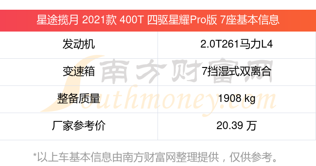 星途攬?jiān)?2021款 400T 四驅(qū)星??Pro版 7座搭載了一臺(tái)2.0T261馬力L4渦輪增壓發(fā)動(dòng)機(jī),采用7擋濕式雙離合自動(dòng)檔變速箱,常規(guī)整備質(zhì)量1908kg,廠(chǎng)家參考價(jià)20.39萬(wàn)元。