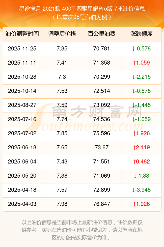 依照11月25日95號(hào)汽油最新調(diào)整價(jià)格7.35元/升來(lái)計(jì)算(以重慶為例),該車(chē)型百公里的平均油費(fèi)是70.781元,依照上一輪11月11日調(diào)整價(jià)格7.41元/升來(lái)計(jì)算,百公里的平均油費(fèi)是71.358元,對(duì)比上一輪少花0.578元,下一輪的油價(jià)調(diào)整時(shí)間12月8日24時(shí)。