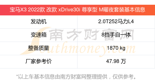 寶馬X3 2022款 改款 xDrive30i 尊享型 M曜夜套裝動力上搭載的是一臺2.0T252馬力L4渦輪增壓發(fā)動機,匹配8擋手自一體自動檔變速箱,燃料形式為汽油,常規(guī)整備質(zhì)量1870kg,廠家參考價47.98萬元。