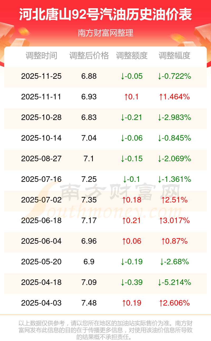 2025年92號(hào)汽油價(jià)格調(diào)整一覽表