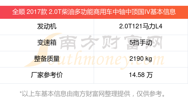 全順 2017款 2.0T柴油多功能商用車(chē)中軸中頂國(guó)IV動(dòng)力上配備的是一臺(tái)2.0T121馬力L4渦輪增壓發(fā)動(dòng)機(jī),匹配的是5擋手動(dòng)擋變速箱,燃料形式為柴油,常規(guī)整備質(zhì)量2190kg,廠家參考價(jià)14.58萬(wàn)元。
