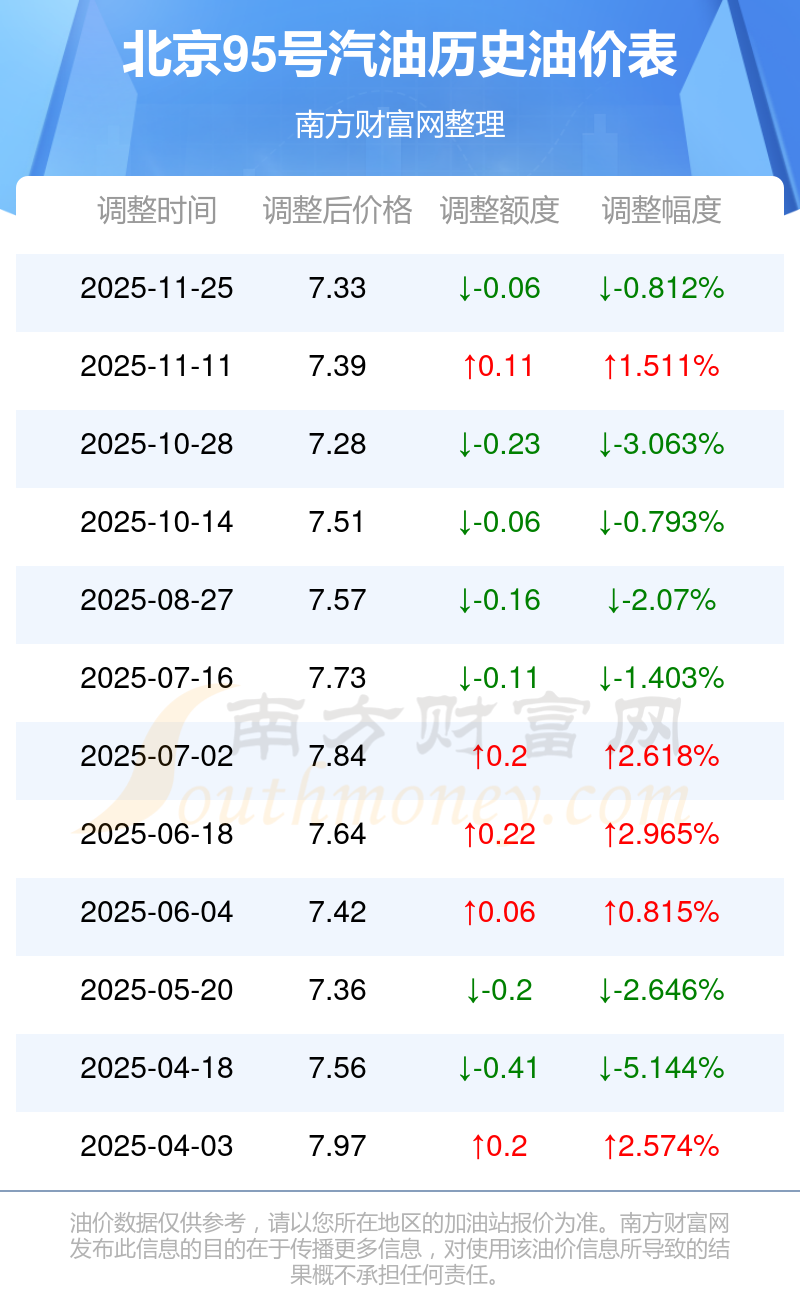 12月4日,北京95號汽油的價格是7.33元每升,本次的調(diào)整時間為11月25日,對比上次的調(diào)整降了0.06元,降0.812%,下次調(diào)整時間為12月8日24時,還有4.65天。