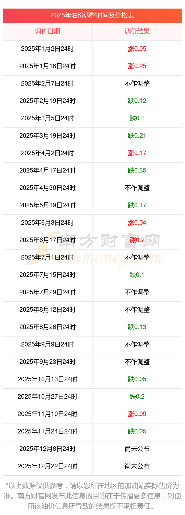 油價調(diào)整最新消息:12月4日溫州汽油、柴油每升的價格是多少?詳情如下:95號汽油為7.3元,下調(diào)了0.06元;92號汽油為6.86元,下調(diào)了0.06元;89號汽油為6.36元,下調(diào)了0.05元;0號柴油為6.51元,下調(diào)了0.06元,調(diào)整時間為11月25日。溫州下一輪油價調(diào)整時間12月8日24時,距離現(xiàn)在還有4.64天。