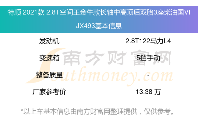 特順 2021款 2.8T空間王金牛款長軸中高頂后雙胎3座柴油國VI JX493動力方面,搭載的是一臺2.8T122馬力L4渦輪增壓發(fā)動機,匹配5擋手動擋變速箱,燃料形式為柴油,廠家參考價13.38萬元。