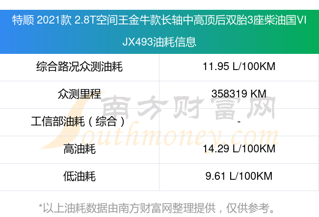 根據(jù)車主實測數(shù)據(jù),該車型低油耗為9.61升/百公里,高油耗為14.29升/百公里,綜合路況眾測油耗為11.95升/百公里。