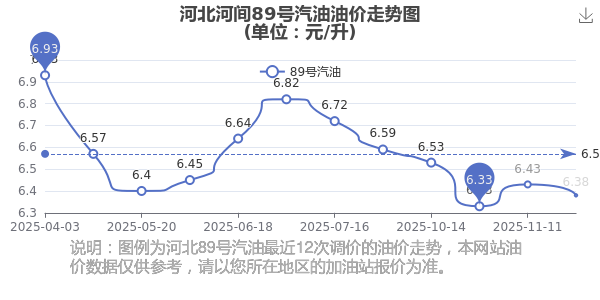 12月4日,河北河間汽油、柴油每升最新價格為(11月25日調(diào)整后的價格):92號汽油為6.88元,減了0.05元,減幅達0.72%;95號汽油為7.26元,減了0.06元,減幅達0.82%;89號汽油為6.38元,減了0.05元,減幅達0.78%;0號柴油為6.52元,減了0.06元,減幅達0.91%。河北河間下一輪油價調(diào)整時間12月8日24時,距離現(xiàn)在還有4.62天。