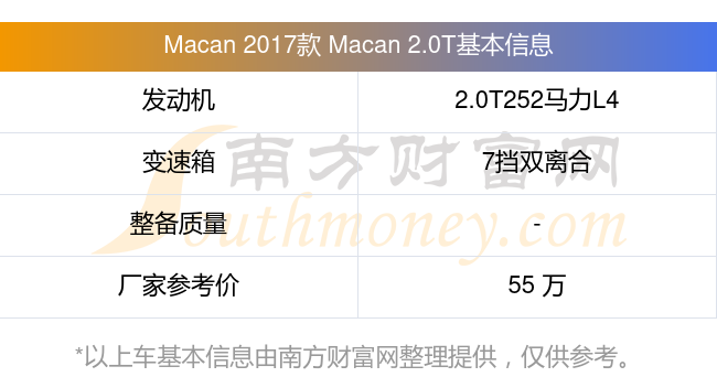 Macan 2017款 Macan 2.0T搭載了一臺2.0T252馬力L4渦輪增壓發(fā)動機,采用7擋雙離合自動檔變速箱,廠家參考價55萬元。