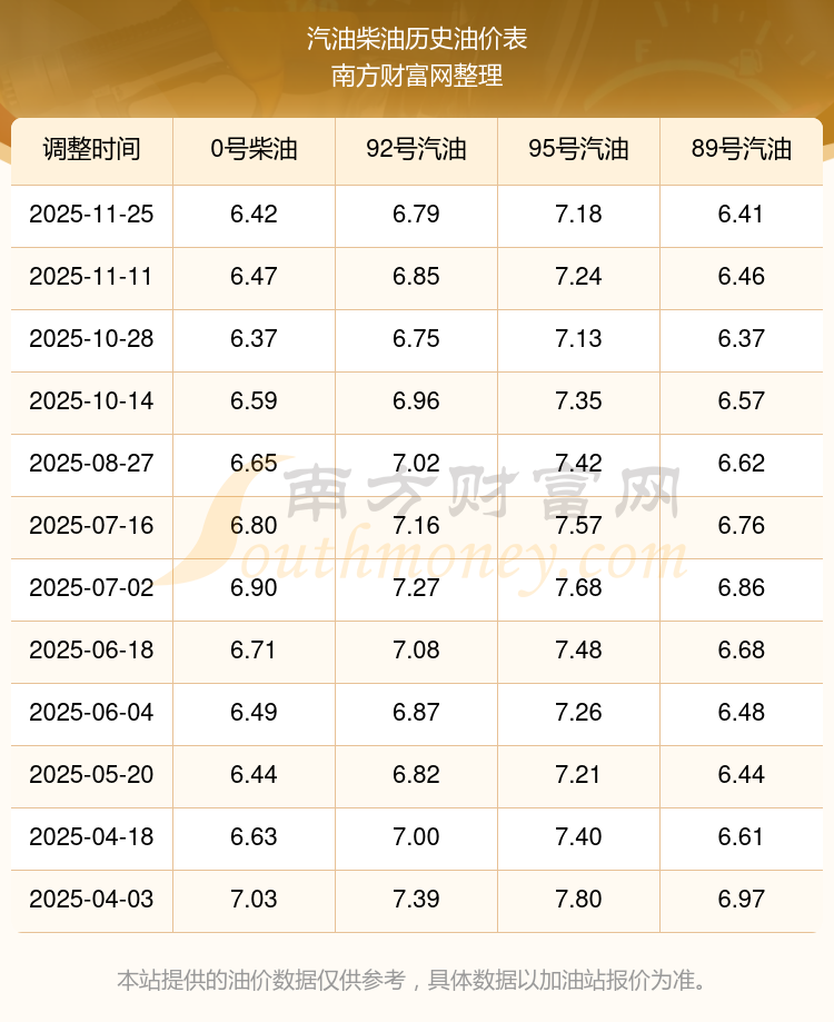 2025年汽油柴油油價(jià)調(diào)整一覽表