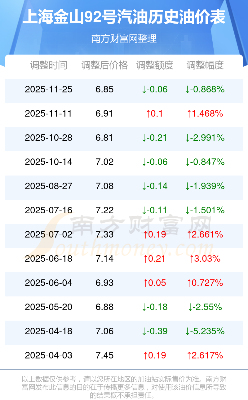 上海金山92號(hào)汽油12月4日價(jià)格(11月25日調(diào)整后的價(jià)格):6.85元每升,對(duì)比上次調(diào)整(11月11日)的價(jià)格6.91元每升下調(diào)了0.06元,下調(diào)幅達(dá)0.868%。下一輪油價(jià)調(diào)整時(shí)間12月8日24時(shí),距離現(xiàn)在還有4.59天。