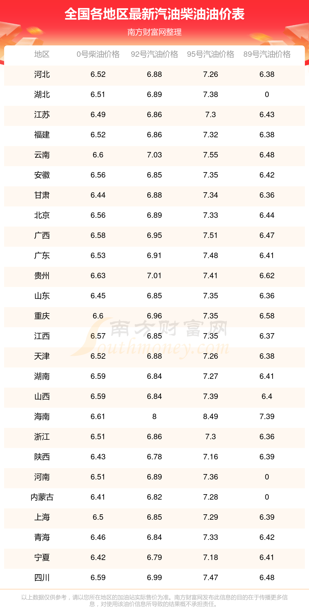 以上數(shù)據(jù)僅供參考,請(qǐng)以您所在地區(qū)的加油站實(shí)際售價(jià)為準(zhǔn)。南方財(cái)富網(wǎng)發(fā)布此信息的目的在于傳播更多信息,對(duì)使用該油價(jià)信息所導(dǎo)致的結(jié)果概不承擔(dān)責(zé)任。