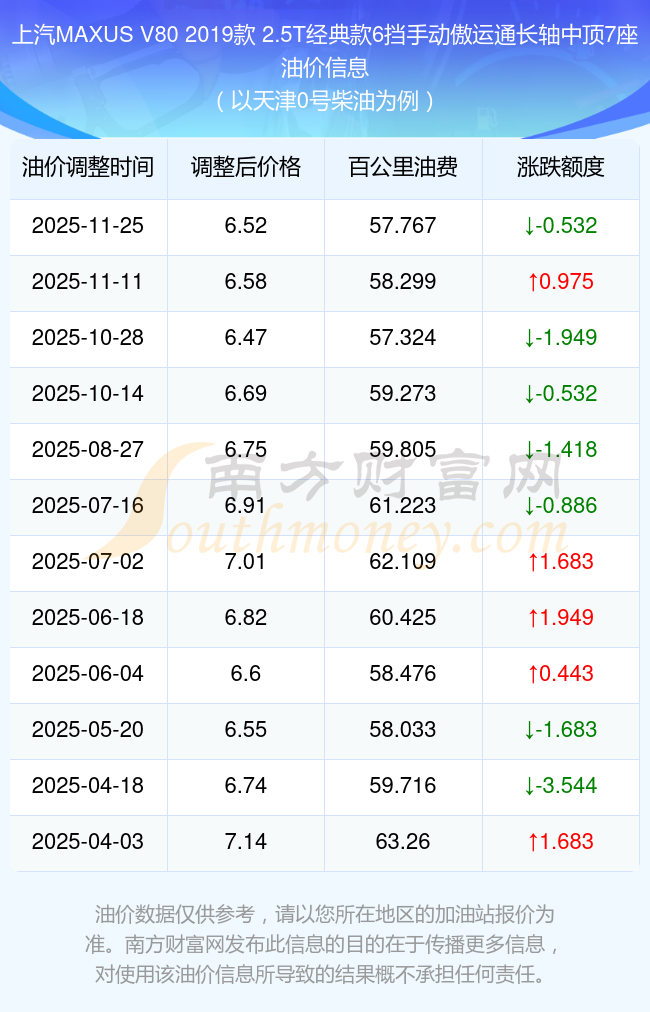 按照11月25日0號柴油最新調(diào)整價格6.52元/升來計算(以天津為例),該車型百公里平均油費為57.767元,按照上一輪11月11日調(diào)整價格6.58元/升來計算,百公里平均油費為58.299元,對比上一輪少花0.532元,下一輪油價調(diào)整時間為12月8日24時。