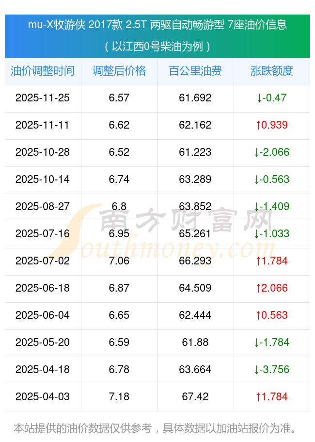 按照11月25日0號柴油最新調(diào)整價格6.57元/升來計算(以江西為例),該車型百公里平均油費為61.692元,按照上一輪11月11日調(diào)整價格6.62元/升來計算,百公里平均油費為62.162元,對比上一輪少花0.47元,下一輪油價調(diào)整時間為12月8日24時。