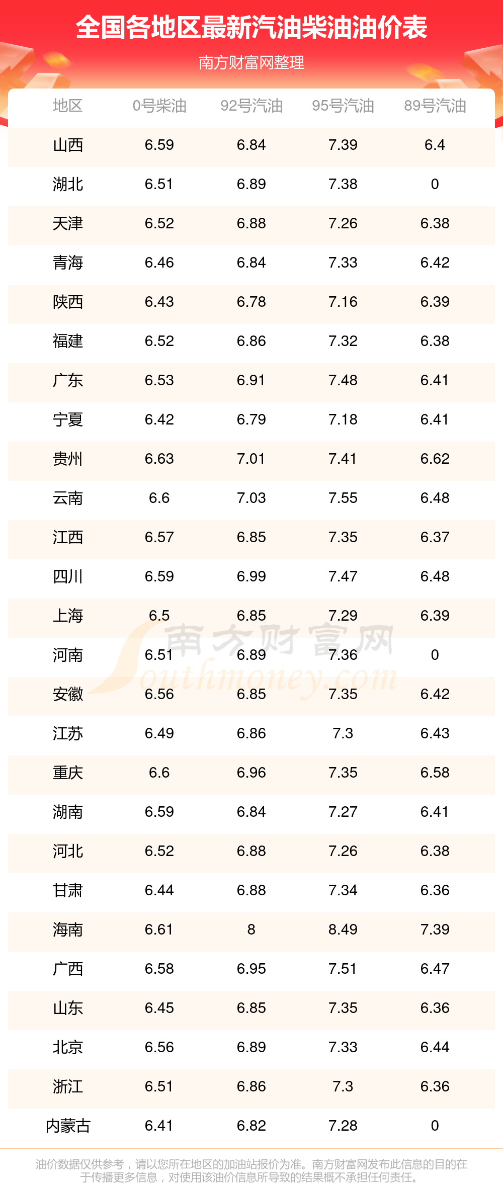 以上油價信息是當前市場上最新油價信息,油價數據僅供參考,實際在售油價可能有小幅偏差,請以您所在地區(qū)的加油站實際售價為準。