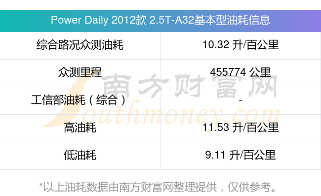 根據(jù)車主實(shí)測(cè)數(shù)據(jù),該車型低油耗為9.11升/百公里,高油耗為11.53升/百公里,綜合路況眾測(cè)油耗為10.32升/百公里。