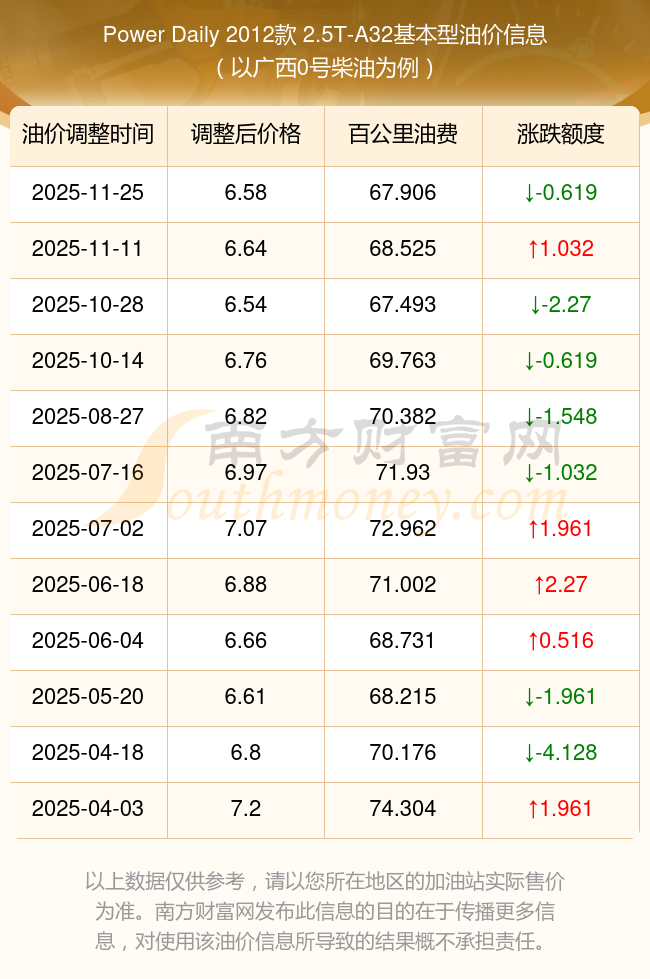 依照11月25日0號(hào)柴油最新調(diào)整價(jià)格6.58元/升來計(jì)算(以廣西為例),該車型百公里的平均油費(fèi)是67.906元,依照上一輪11月11日調(diào)整價(jià)格6.64元/升來計(jì)算,百公里的平均油費(fèi)是68.525元,對(duì)比上一輪少花0.619元,下一輪的油價(jià)調(diào)整時(shí)間12月8日24時(shí)。
