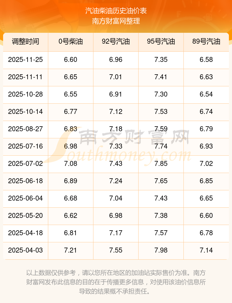 2025年95號汽油價格一覽表