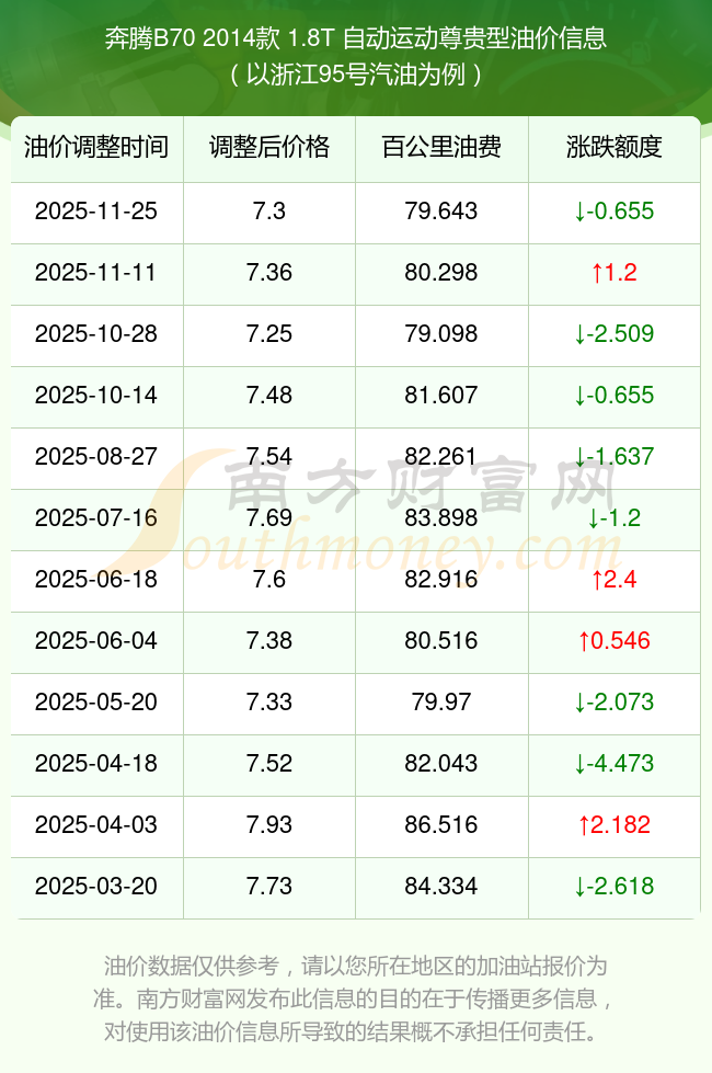 按照11月25日95號汽油最新調(diào)整價格7.3元/升來計算(以浙江為例),該車型百公里平均油費為79.643元,按照上一輪11月11日調(diào)整價格7.36元/升來計算,百公里平均油費為80.298元,對比上一輪少花0.655元,下一輪油價調(diào)整時間為12月8日24時。